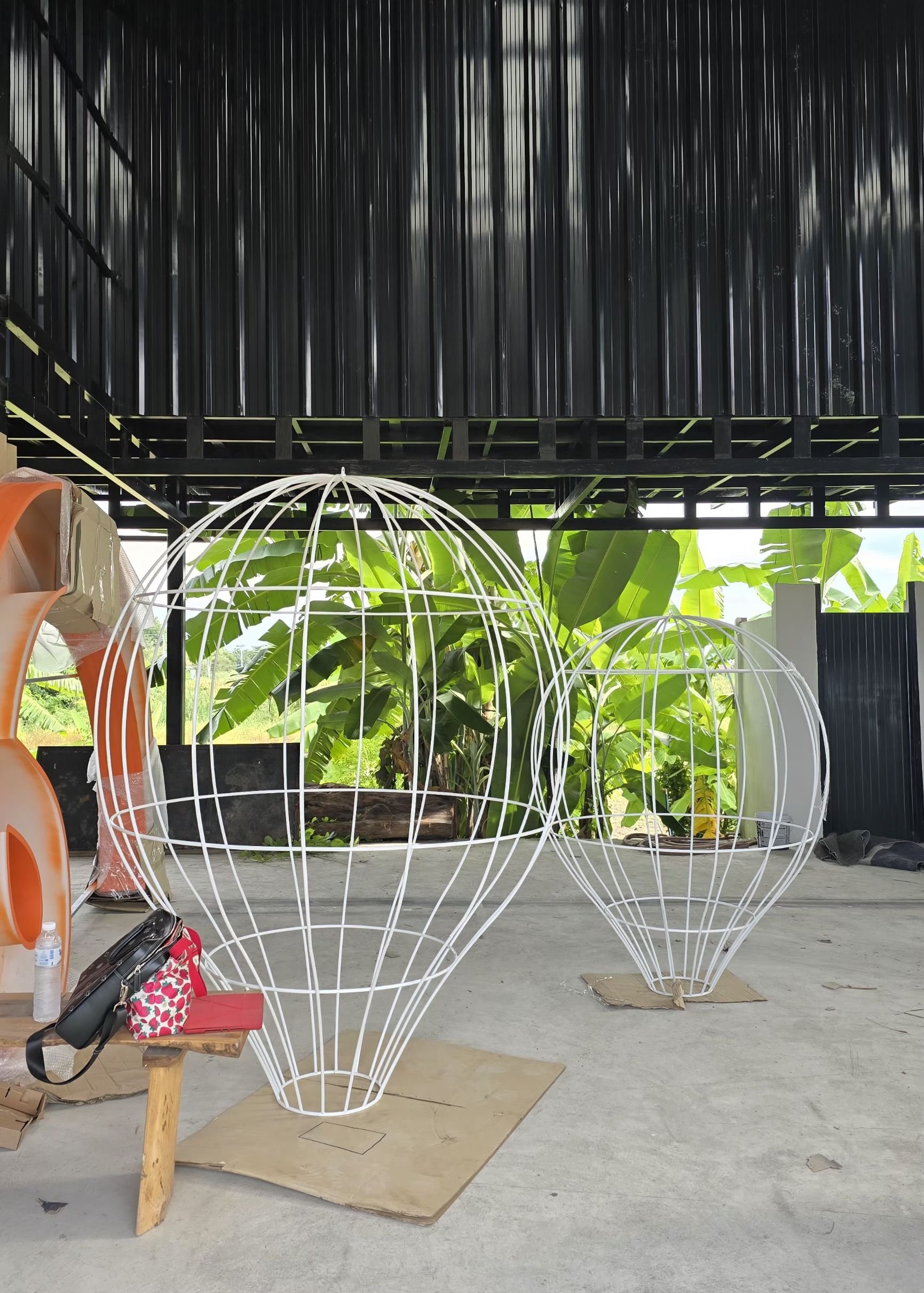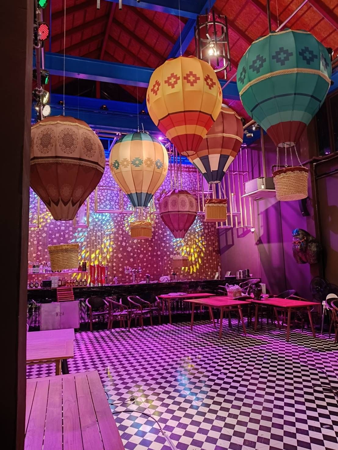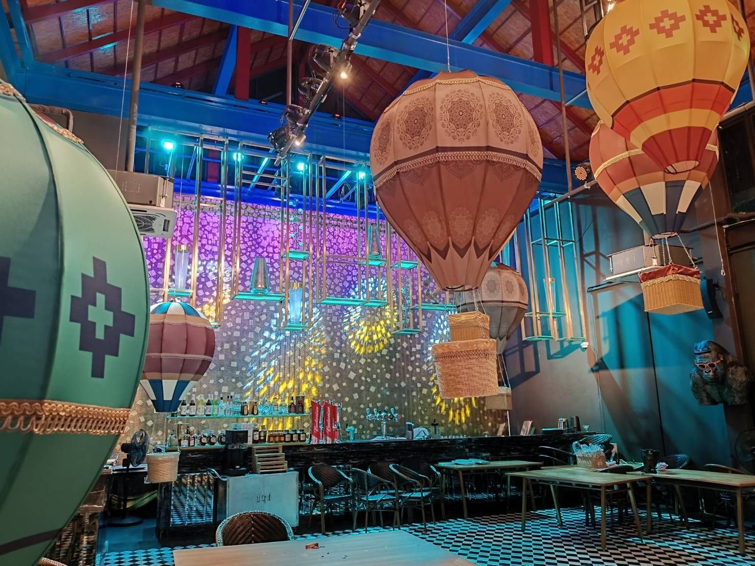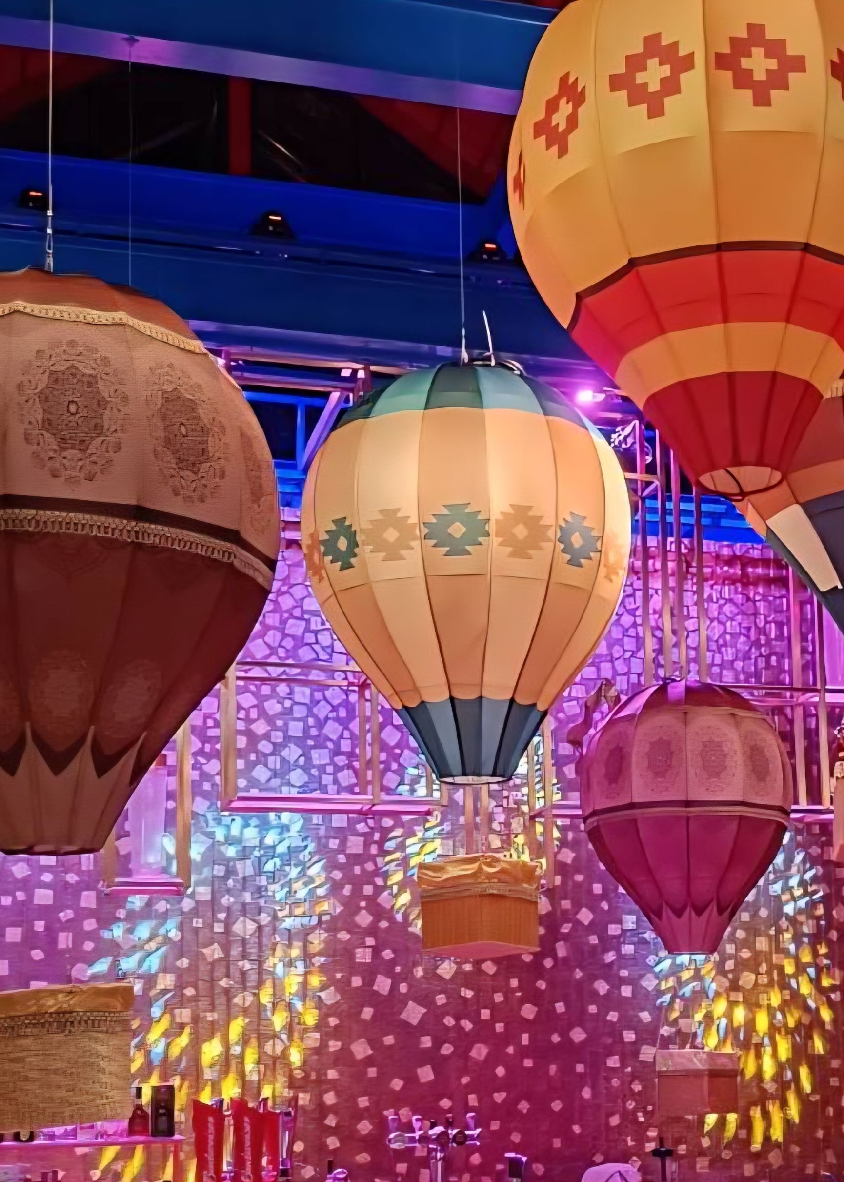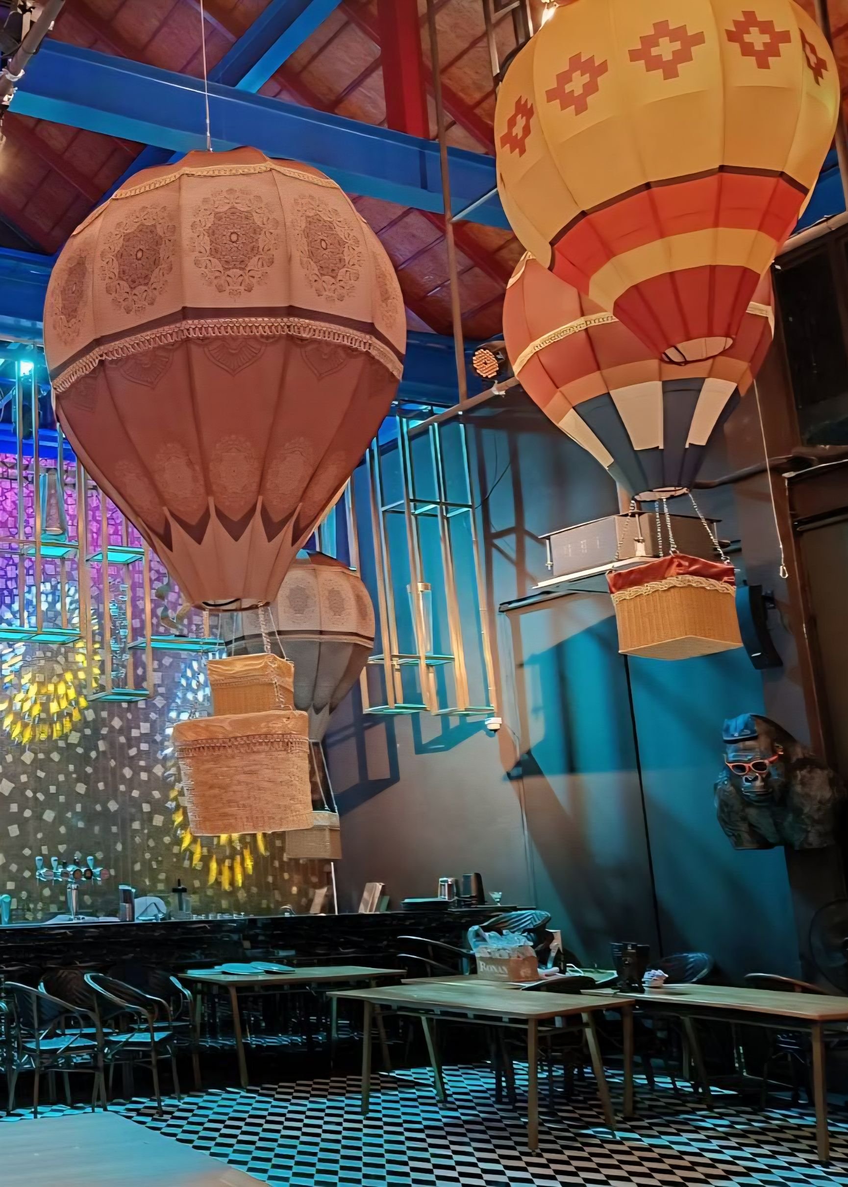 จากผลงานในภาพ เป็นงาน ผลิตโคมไฟตกแต่งร้านอาหารในรูปทรงบอลลูนอากาศร้อน (Hot Air Balloon Lamp) ขนาดใหญ่ ติดตั้งภายในร้านเพื่อสร้างบรรยากาศโดดเด่น สะดุดตา และเป็นจุดถ่ายรูป (แลนด์มาร์คภายในร้าน)